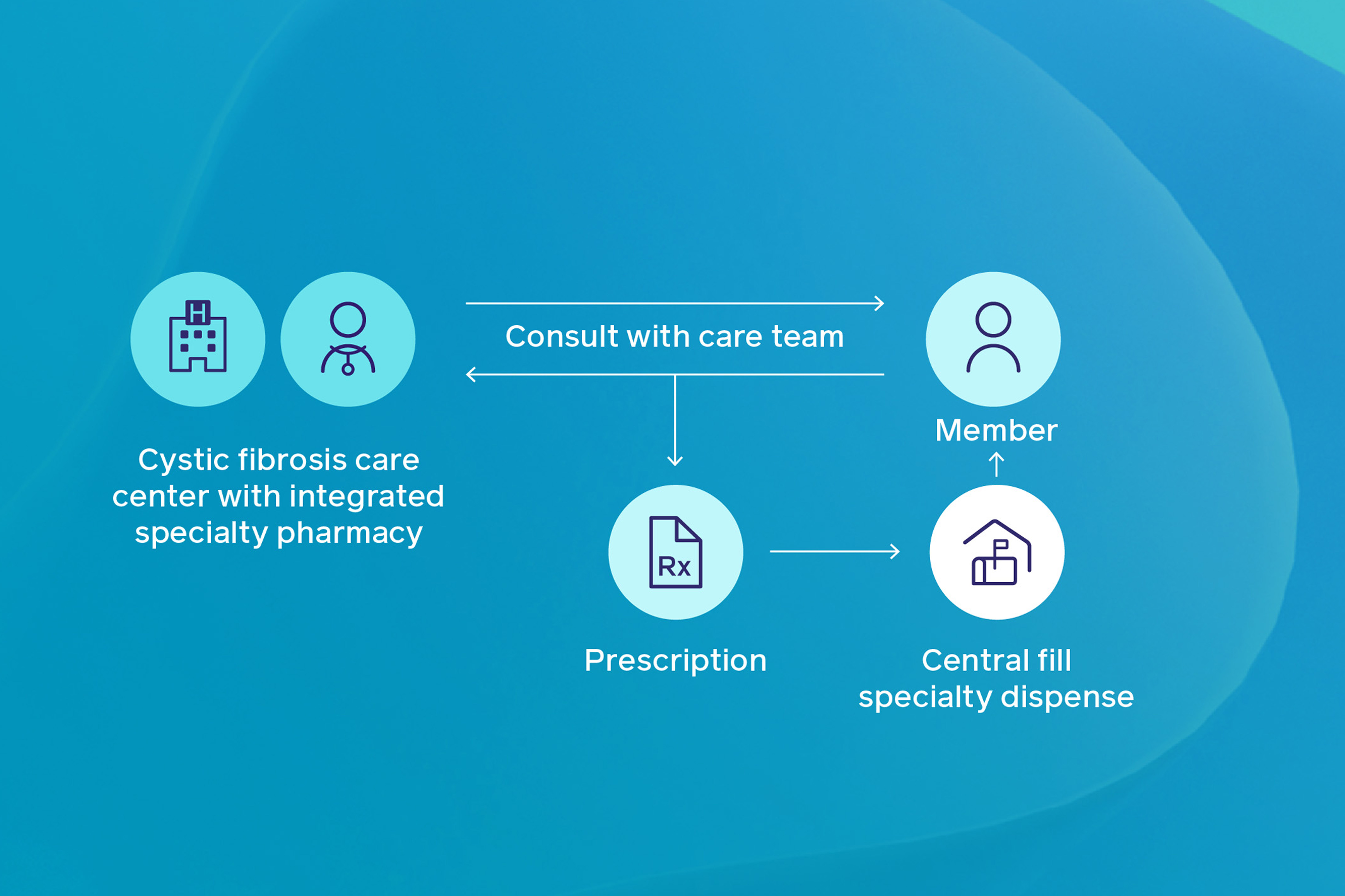 With IntegratedRx®– Cystic Fibrosis, applicable members can get their drugs from an in-house pharmacy and work with an integrated care team. Members with cystic fibrosis can pick up their prescriptions and companion medicines right in their provider’s clinic or at their hospital’s pharmacy. This means they have immediate access to these important drugs and strong communication across their care teams, creating a better experience.